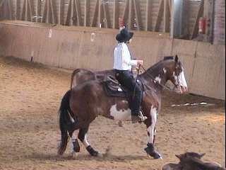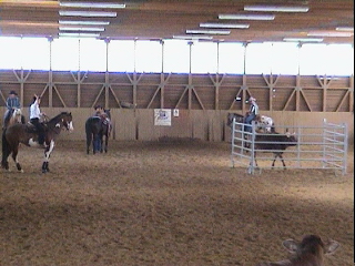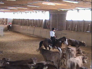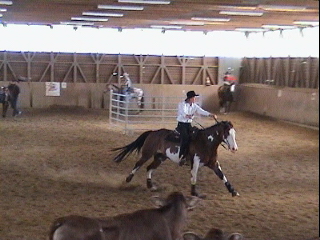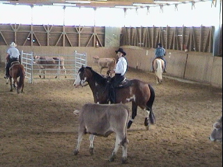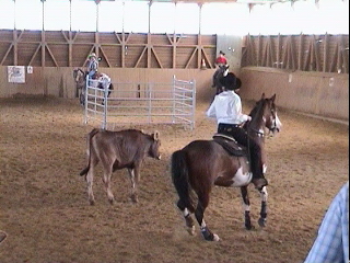 hier noch ein paar Bilder von einem Playday Mai 2003 - ich hatte an dem Wochenende mit Charlie einen Rinderkurs mit anschliesendem Playday und da an dem Tag ein Pferd ausfiel , zerrte ich die dicke , voellig untrainierte Mama mit dem 1 1/2 Monate alten Fohlen von der Weide , fuhr hin , Fohlen in eine Box , Sattel rauf und Pretty machte souveraen ihren Job und durfte dann wieder zurueck ! Das nenne ich Westernpferd !!!!