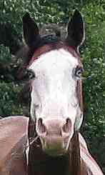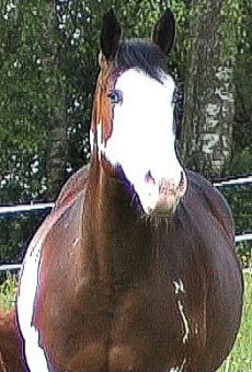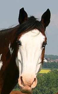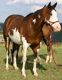 Pretty ist 3jaehrig sozusagen frisch aus den Staaten zu uns gekommen . Wir kauften sie bei einem Pferdehaendler bei Nuernberg ! Pretty ist schon immer ein sozusagen lustiges Kerlchen (Maedchen ) gewesen . Sie hupft im Padock wie ein Geisbock rum und hat bei uns den Spitznamen " alter Gockel " ! Ein Brueller und sie macht einen Rollback auf den Hintern - das schafft sie sogar hochtragend ! Sie ist ein Ranchhorse , wie aus dem Lehrbuch - unwahrscheinlich wendig , dynamische Rollbacks , tiefe Stopps , genial am Rind , souveraen und ruhig abwartend in der Cowhorse , immer in der richtigen Position bleibend ! Im Gelaende scheufrei , ausser natuerlich der Fruehling juckt ! Ein tolles vorsichtiges Kinderpferd , sehr rittig und eine unkomplizierte Mama . Ich war mit ihr nur zwei mal auf einem Turnier - dort holten wir uns zwei Meistertitel - in Reining Amateur und in Barrelrace Amateur . Sie wird jetzt nur noch in der Zucht oder zum ausreiten genutzt , da ich mich auf die Hengste konzentrieren muss . Pretty wurde verkauft wegen Zuchtumstellung Anfang 2005 - sie hatte mir über die Vaterseite zu viel Pleasureblut und als Overo war sie mir zu gefährlich in der Anpaarung mit einem reinerbigen Tobiano (ich sag nur weisses Pferd mit braunem Ohr)